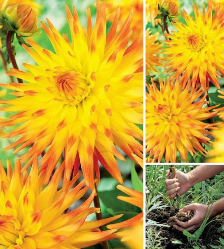 Полукактусовые георгины являются переходным вариантом между кактусовыми и декоративными георгинами. Лепестки более широкие у основания и свернуты в трубочку только на половину (или менее) длины, как правило прямые и расходящиеся во все направления от центра. Форма цветка махровая.