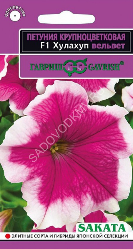 Популярная в профессиональном озеленении серия гибридных петуний вызовет несомненный восторг у садоводов-любителей. Отличается суперранним (в среднем на 12 дней раньше, чем другие крупноцветковые петунии) цветением. Компактный сильноветвистый кустик обильно усыпан бархатистыми цветками (7,5-8,0 см в диаметре) пурпурно-розового оттенка с контрастным белым ободком по волнистому краю. Посев проводят с февраля по март поверхностно, под стекло, после появления всходов стекло убирают. При зимнем посеве всходам необходима подсветка. Всходы появляются через 7-12 дней. На постоянное место высаживают, когда минует опасность заморозков. Цветет с конца мая весь сезон. Светолюбива и достаточно засухоустойчива. Предпочитает легкие, плодородные, хорошо дренированные почвы. Серия «Хулахуп» идеальна для выращивания в корзинах, контейнерах, на клумбах, рабатках и бордюрах. Великолепно подойдет для профессионального выращивания на продажу.