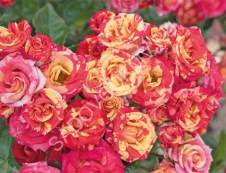 Цветки размером 6-7 см раскрывшись, желтые, но края лепестков со временем становятся ярко-алыми, а затем малиновыми, в то время, как желтый цвет выгорает. Темно-зеленая, глянцевая листва.