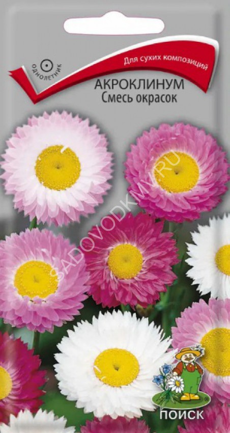 Акроклинум — это однолетние и многолетние цветы, вырастают высотой до 60 сантиметров., с прямостоящим стеблем, размер цветков средний, без запаха. Родина этого цветка тропики и субтропики, хотя в средней полосе тоже очень хорошо растут. Кусты растения почти лишены листьев и лишь в конце стебля образовываются красивые цветочки. Акроклинум очень похож своими соцветиями на маргаритку, но бутоны более жесткие. Чаще всего растение имеет цветы розового или белого окраса, но встречаются и другие оттенки.