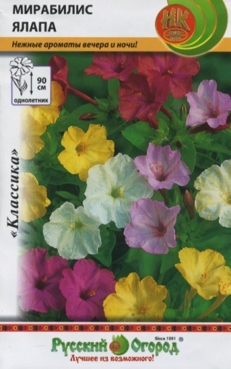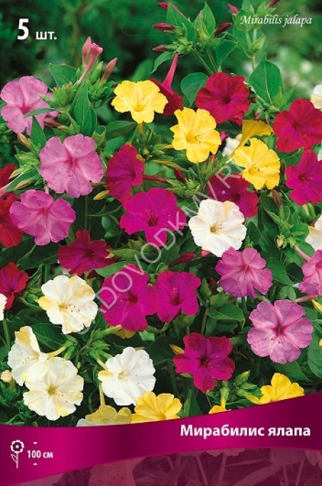 Мирабилис ялапа или Ночная красавица родом из Мексики. Однолетние растение вырастающее до полутора метров, имеет разновидности до 30 сантиметров высотой. Листья расположены супротивно. Кустики округлые, стебли прямые с густыми ветвями,цветки воронковидные, до 3 см в диаметре. Окрас бывает разный — белые, оранжевые, красные, желтые, двухцветные. Открываются примерно в 17.00 и закрываются утром следующего дня. Плод состоит из одного семени, довольно крупный, темно-коричневый. Всхожесть сохраняется до трех лет. Обильно цветет с июня до заморозков.