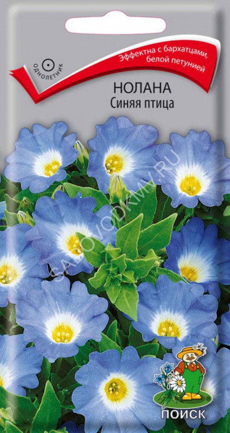 Нолана родом из Перу. Однолетние растения, которые в высоту достигают всего 15 см. Имеет расстилающиеся стебли, образующие коврик диаметром до семидесяти сантиметров. Листья —  темно-зеленые. Имеет крупные цветки в форме колокольчика и диаметром 5 см. Цвет венчика голубой, дна —  белое или кремовое. Цветут с июня и до сентября.
