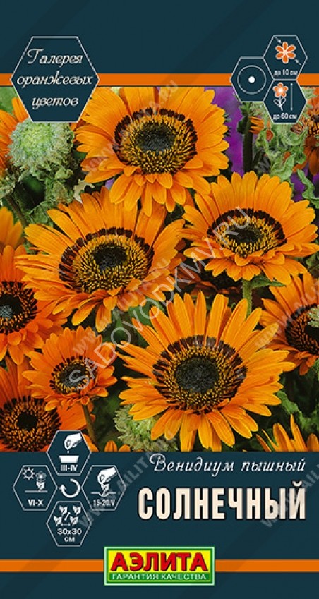 Венидиум пышный. Venidium fastiosum. Эффектное мощное однолетнее травянистое растение высотой 60-80 см. Листья и стебли серебристого цвета, опушенные. Венидиум пышный Venidium fastiosum непрерывно цветет практически все лето. Светолюбив и холодостоек. Высокие стебли растения склонны к полеганию, поэтому венидиум часто требует подвязки к опоре. В дождливую и пасмурную погоду его крупные цветки закрываются.