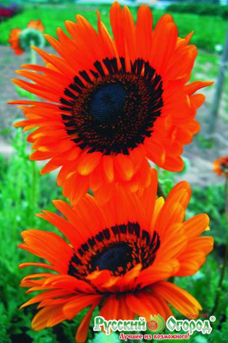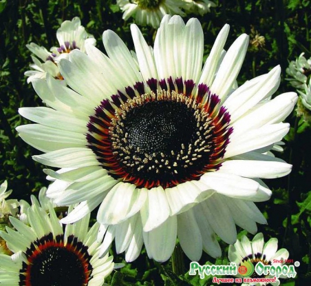 Цветение длительное, июнь-август. Ромашковидные крупные до 10 см в диаметре цветки оранжевого, кремового или белого цвета с черной глянцевой сердцевиной.