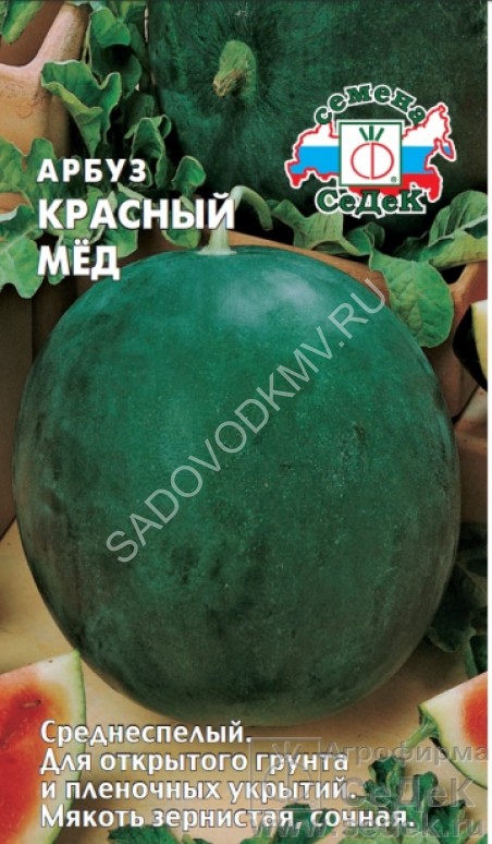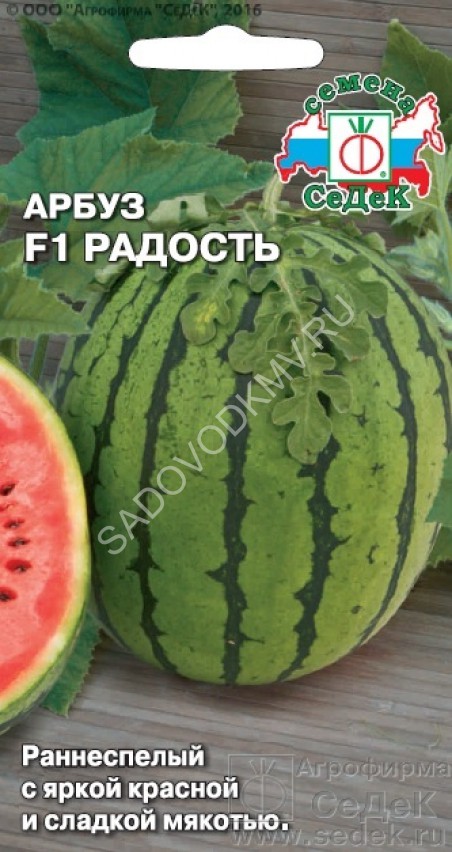 Описание растения: Раннеспелый. Период от полных всходов до первого сбора плодов 78-95 дней. Растение плетистое. Главная плеть средней длины. Лист среднего размера, серо-зеленый, сильнорассеченный. Плод широкоэллептической формы, гладкий, массой 1,0-2,4 кг. Фон темно-зеленый со слабозаметными черно-зелеными полосами. Кора тонкая, гнущаяся,на разрезе - белая. Мякоть темно - красная, нежная, сочная, сладкая.