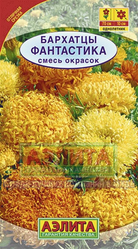 Высокорослые бархатцы с очень крупными (Ø 10-12 см) густомахровыми соцветиями. Кусты высотой до 90 см, хорошо ветвятся и обильно цветут на протяжении всего сезона. Растения засухоустойчивые, не требовательные