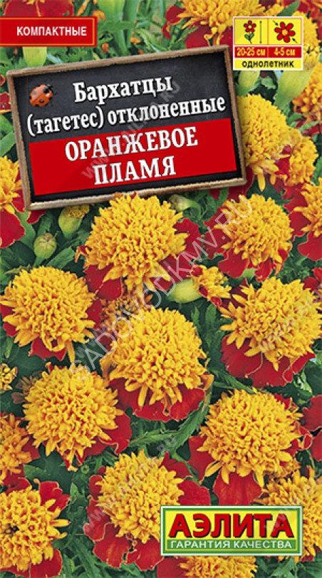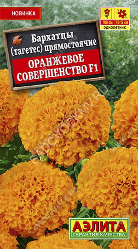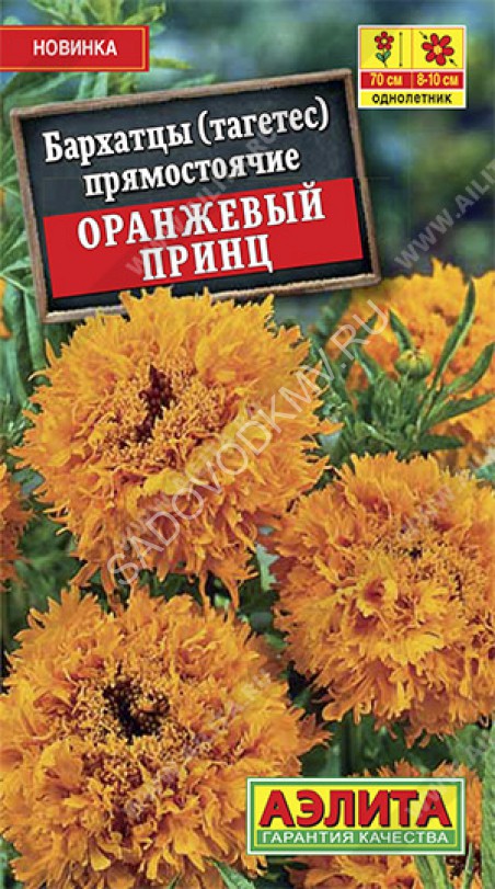 Новый высокорослый сорт голландской селекции. Мощные кусты высотой 80-90 см зацветают через 2,5 месяца от посева. Роскошные ослепительно-оранжевые соцветия Ø 8-10 см создают сильный контраст с темно-зеленой листвой и радуют глаз с июня до заморозков. Цветение очень щедрое для бархатцев прямостоячих. Сорт рекомендуется для срезки и оформления цветников (высокие группы, бордюры, центр многоярусной клумбы). Растения можно посадить в огороде и аптекарском садике пряных трав. Лепестки соцветий в свежем и сушеном виде используют в кулинарных целях. Это богатейший природный источник лютеина, очень полезного для здоровья глаз.