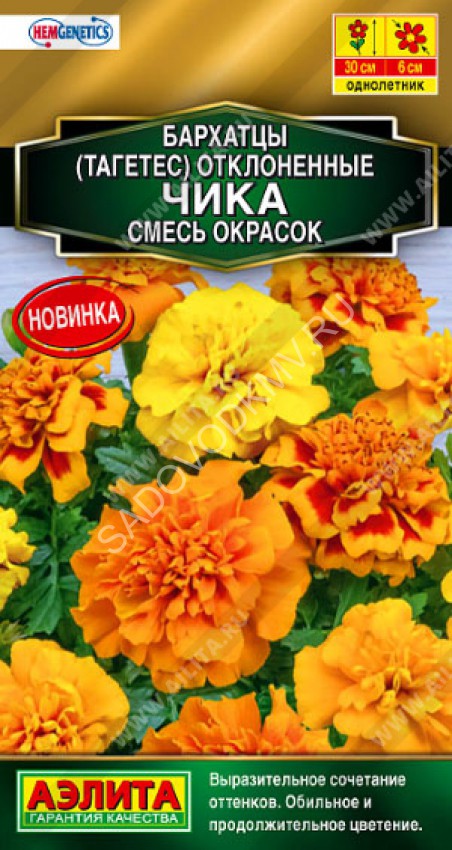 Выразительный, компактный сорт с густооблиственным кустиком высотой 30 см и махровыми соцветиями, диаметром 6 см, сочного, ярко-оранжевого оттенка. Идеально подойдет для оформления бордюров, рабаток, вазонов и балконных ящиков. Цветет с июня до заморозков. Бархатцы светолюбивы и теплолюбивы, заморозков не переносят, к почвам нетребовательны, но предпочитают плодородные легкие почвы. Посев на рассаду проводят во второй половине марте-начале апреля. Всходы появляются через 4-8 дней после посева, сеянцы пикируют в фазе 2-го настоящего листа. Рассаду высаживают в начале июня с расстоянием между растениями 30-35 см. Посев в открытый грунт проводят в мае на глубину 1,5-2 см.