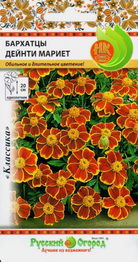 Очень жизнерадостный сорт простых однорядных бархатцев. Кустики мощные, высотой 20 см, с прочными стеблями и опрятной здоровой зеленью. «Полосатое» чередование оранжевого и ярко-желтого оттенка на лепестках (внешних цветках соцветия) добавит декоративной композиции объема и сияния. Рекомендуется высаживать как акцентное растение в смешанные цветники, бордюры и рабатки. Растение светолюбивое и теплолюбивое, заморозков не переносит. Выращивают рассадным способом или посевом в открытый грунт. Посев проводят во второй половине марта-начале апреля. Всходы появляются через 7-14 дней после посева, сеянцы пикируют в фазе 2-го настоящего листа. Рассаду высаживают в начале июня, расстояние между растениями 15-20 см. Можно высевать в открытый грунт в конце мая-начале июня, когда минует угроза заморозков.