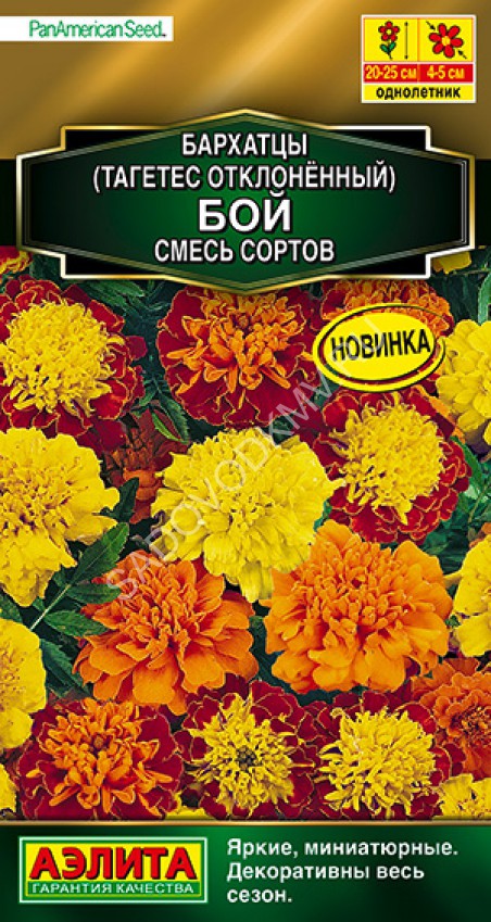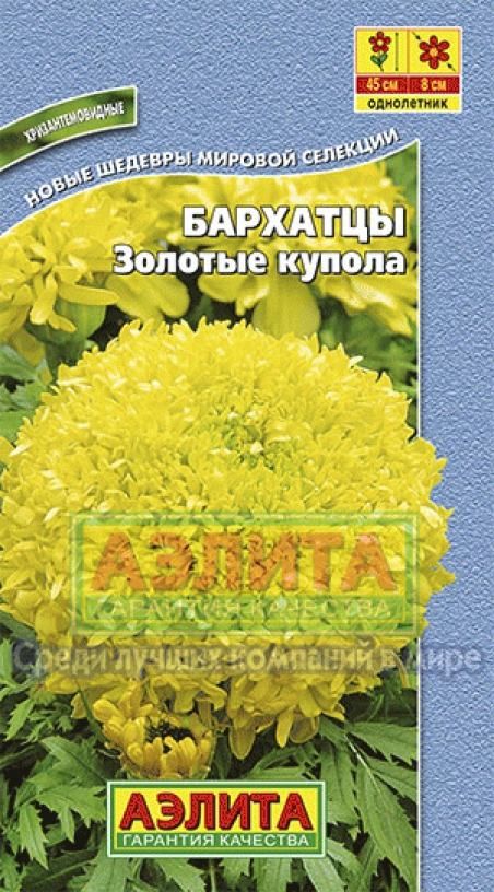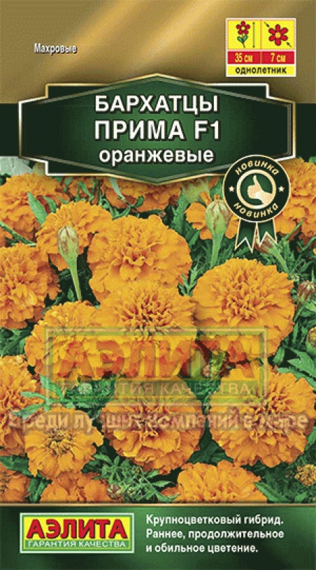 Прямостоячий ветвистый куст высотой 30 см, диаметром 30 см. Соцветия оранжевые, махровые, диаметром 8-10 см. Светолюбивы, теплолюбивы, заморозков не переносят. Предпочитают плодородные легкие почвы. Для оформления бордюров, рабаток, вазонов и балконных ящиков.