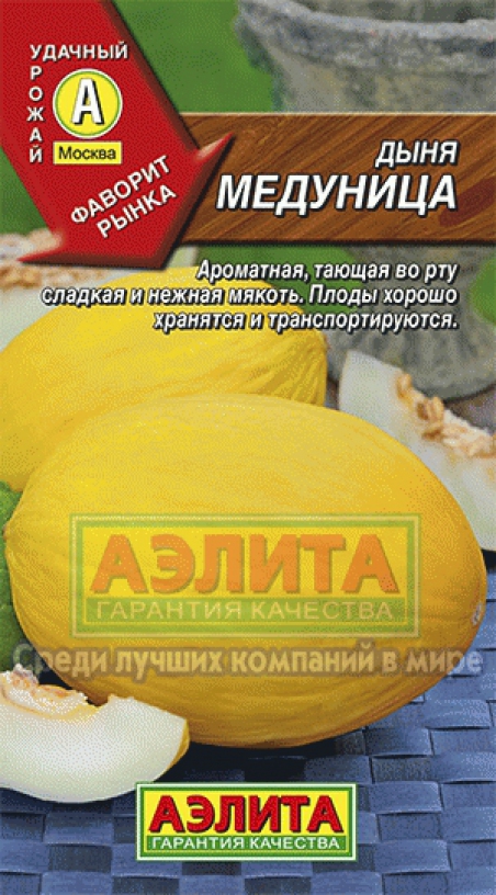 Позднеспелый (82-111 дней от всходов до первого сбора плодов) сорт. Растение плетистое, главная плеть длиной 1,5-2,0 м. Плод округлый, желто-зеленый, без рисунка, с крупноячеистой сеткой. Мякоть белая, средней толщины, плотная, сочная, с дынным ароматом. Масса плода 1,2-3,2 кг. Вкусовые качества отличные. Засухоустойчивый транспортабельный сорт. Плоды сохраняют вкусовые качества в течение 30 дней после съема. Урожайность 2,0-3,0 кг/м?. Посев на рассаду – в конце апреля. Высадка рассады в конце мая – начале июня в возрасте 30-35 дней. Схема посадки: 40-50х80-100 см. В южных регионах выращивают врасстил в открытом грунте прямым посевом в апреле-мае. Растения подвязывают к шпалере, до высоты 50 см удаляют все боковые побеги, последующие прищипывают над 1-3 листом. Для накопления плодами сахара в период плодоношения сокращают поливы.
