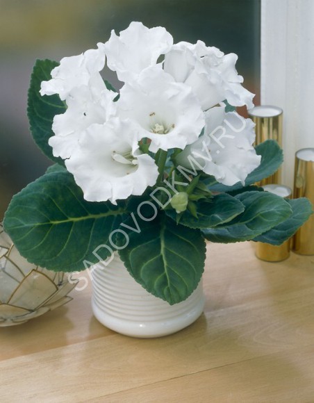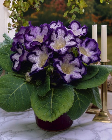 Глоксиния - многолетнее травянистое бесстебельное растение с клубневидным корневищем и супротивно расположенными бархатистыми листьями. Самый эффектный представитель в своем семействе. На одном взрослом растении может быть до 50-100 крупных роскошных цветков-граммофонов. Окраска различная: белая, красная, синяя, с крапом и без, фиолетовая, малиновая.