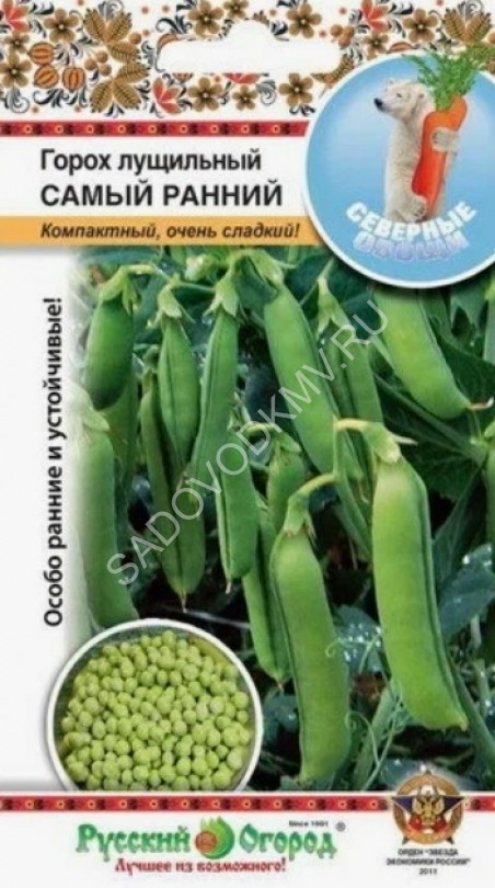 Раннеспелый высокоурожайный сахарный сорт. Растение высотой около 95 см. Бобы светло-зеленые, слабоизогнутые, длиной 11 см, шириной 1,3 см. В пищу используются не только семена, но весь боб (в просторечии – стручок) целиком, вместе со створками – как в свежем виде, так и после легкой кулинарной обработки. Створки боба не имеют жесткого пергаментного слоя, они нежные на вкус, сочные, сладкие. Сорт пригоден для консервирования и замораживания. Вкусовые качества свежего и консервированного горошка отличные. Устойчив к фузариозу.