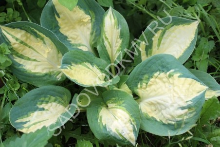 Катерина - высота куста 35 см, ширина 70 см, листья голубые с кремовой полосой по центру.