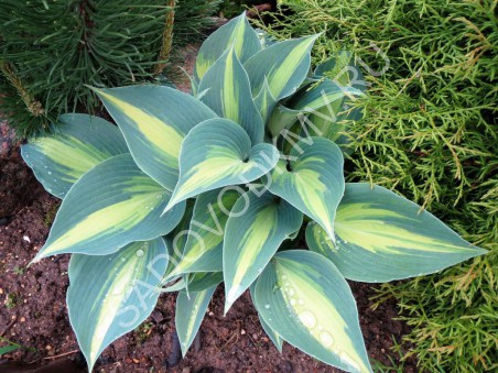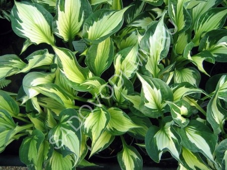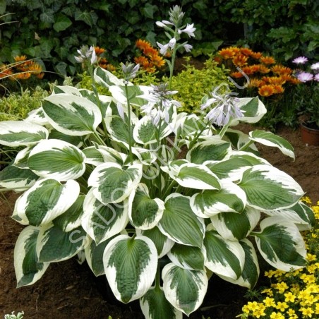 Лейксайд Дрэгонфлай - высота куста 45 см, ширина 75 см, листья сине-зеленые с широкой белой каймой, цветки бледно-лавандовые. Очень эффектная.