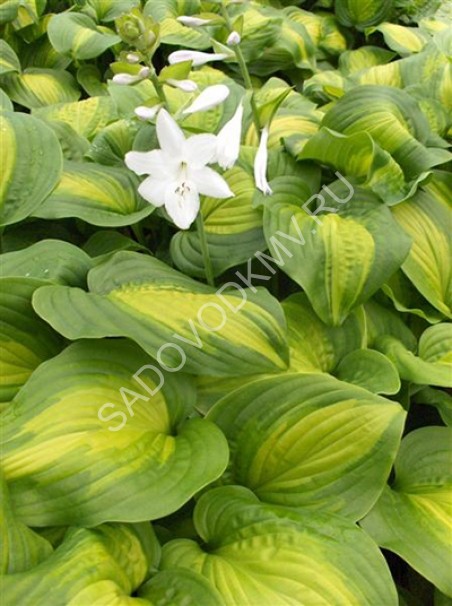Вайд Брим- высота куста 50 см, ширина 75 см. Листья сердцевидные, плотные, морщинистые, ярко-зеленые с неровной желтой полосой по краю, которая затем становится кремово-белой, цветки лиловые. Крупная. Цветение июль-август.