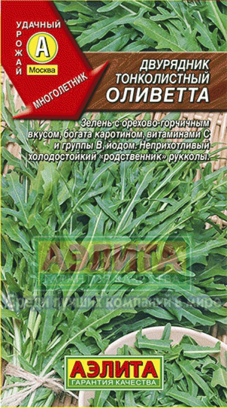 Раннеспелый сорт с большой вегетативной массой. Формирует урожай зелени 2,5 кг/м2 за 24-30 дней от всходов. Розетка густооблиственная, в фазу технической спелости высотой и диаметром 30 см. Масса одного растения 30 г. Листья длинные, широкие, с легким ароматом и горчично-ореховым вкусом.