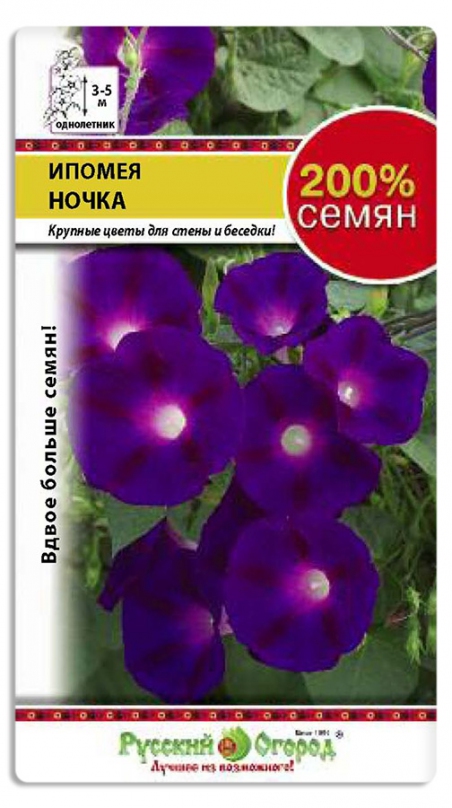 Быстрорастущая однолетняя лиана с эффектными махровыми цветками. Способна за короткий срок подняться на высоту до 200 см и создать великолепный цветущий занавес. Многочисленные цветки Ø5-7 см появляются на растении каждый день и остаются раскрытыми дольше, чем у сортов с простыми цветками. Ипомея тепло- и светолюбивая, не выносит застоя воды. Идеально подходит для озеленения беседок, пергол, навесов, декорирования заборов и для выращивания в садовых контейнерах.