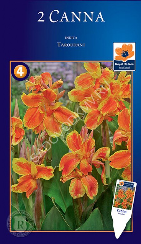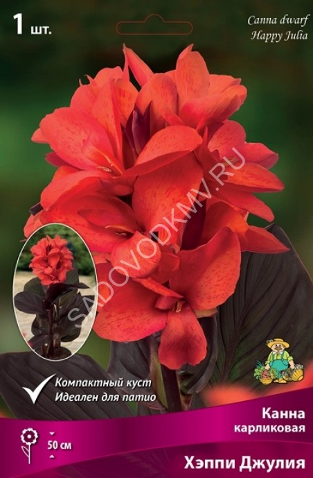 Канна Хэппи Клео - высота растения 50 см, цветок оранжево-желтый с мелким темно-оранжевым крапом. Идеален для патио.