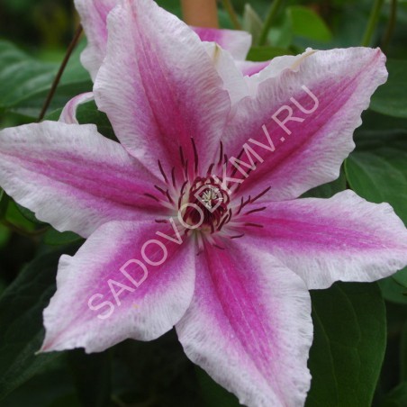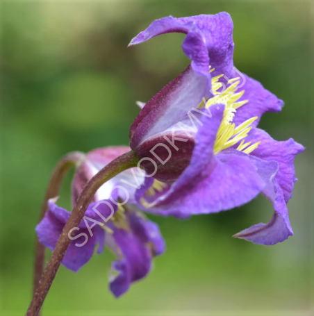 Огромные (диаметром 10-12 см) красивейшие цветки всегда махровые – как на прошлогодних побегах, так и на побегах текущего года. Колокольчикообразные, свешивающиеся, слегка приятно пахнущие грейпфрутом, сидящие на пурпурных цветоножках. Цветет в мае и повторяет цветение, но уже менее обильно –летом. Имеет красивые темно-зеленые относительно крупные (до 20 см длиной и 16 см шириной) листья – тройные, тройчатосложенные, с красивой фактурой и зубчатыми краями. Достигает высоты 2–3 м. За опоры цепляется листовыми черешками. Морозостоек и неприхотлив
