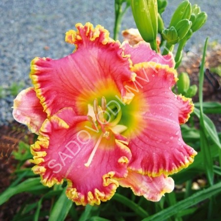 Строберри Кэнди – высота растения 70 см. Цветок нежно-розовый с темным глазком и каймой, зеленое горло, повторное цветение.