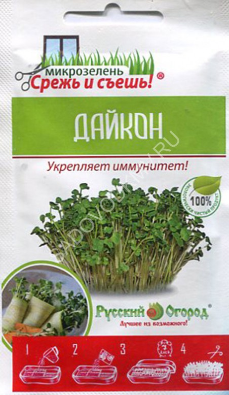 5. Через 7-10 дней (в зависимости от культуры), в фазе первой пары настоящих листьев (2-5 см), микрозелень готова к уборке и содержит максимальное количество полезных веществ.