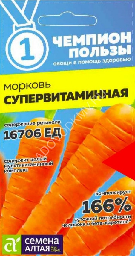 Среднепоздний (120-125 дней от всходов до технической спелости) гибрид Нантского сортотипа с высоким содержанием каротина и сахара в корнеплодах. Рекомендуется для употребления в свежем виде и длительного хранения. Розетка листьев прямостоячая. Корнеплод длинный, ровный, гладкий, цилиндрический с тупым кончиком, темно-оранжевого цвета, массой 100-150 г. Мякоть сочная, сладкая, практически без сердцевины. Гибрид урожайный, устойчив к растрескиванию и цветушности. Посев семян в грунт производится в конце апреля – начале мая на глубину 1 см, расстояние между рядками 18-20 см. Подросшие всходы прореживают, оставляя между растениями по 5-6 см.