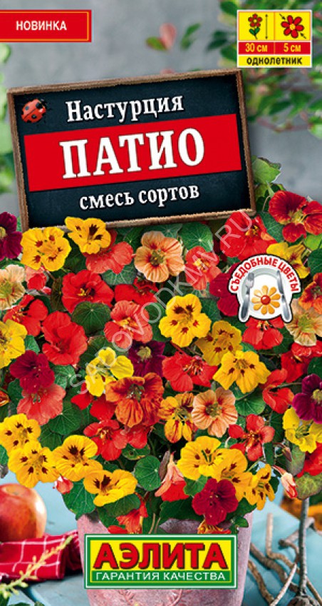 Изумительно красивая вьющаяся настурция с яркими махровыми цветками. Побеги сочные, мясистые, длиной до 150 см, сильноветвистые. Растут быстро. Цветки крупные, Ø5-6 см, обильно украшают кусты с июня до первых осенних заморозков. Растения неприхотливые, тепло- и светолюбивые, способны расти в небольшом объеме земли. Прекрасно впишутся в любой садовый ансамбль, отлично смотрятся на клумбах, рабатках, в подвесных корзинах и садовых контейнерах.