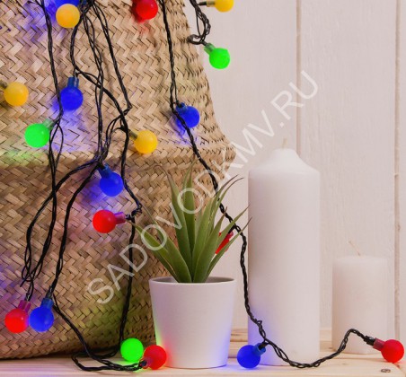 Характеристики:тип: для внутреннего применения, длина гирлянды: 7 м,цвет провода: чёрный,материал провода: ПВХ,количество ламп: 100 шт.,цвет ламп: мульти,режим: контроллер на 8 программ,напряжение: 220 V.