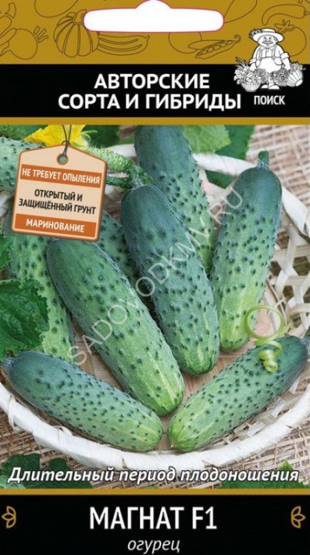Гибрид раннеспелый, партенокарпический. От всходов до начала сбора 40-42 дня. В узле формирует 4-6 зеленцов. Плоды очень короткие, гладкие, светло-зелёного цвета. Длиной 8-10 см, диаметром 3-3,5 см, массой около 70 г. Гибрид устойчив к обыкновенной огуречной мозаике, и вирусу пожелтения жилок огурца. Плоды обладают восхитительным вкусом и душистым ароматом, замечательно подходят для свежего потребления. Выращивается в теплицах и открытом грунте. Урожайность 12-16 кг/м2.