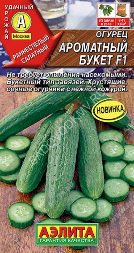 Раннеспелый (40-45 дней) партенокарпический гибрид для открытого грунта и пленочных укрытий. Растение среднерослое, плетистое, с букетным плодообразованием. В одном узле формирует 3-7 завязей. Зеленцы цилиндрические, частобугорчатые, темно-зеленые, равномерно окрашенные, длиной 10-12 см, плотные, ароматные, без горечи. Урожайность 10,5-13 кг/м2. Ценность гибрида: устойчивость к кладоспориозу, огуречной мозаике, настоящей мучнистой росе, характеризуется обильным и дружным плодоношением. Назначение универсальное.