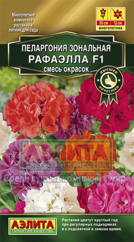 Популярное многолетние комнатное растение из семейства Гераниевых. В пору обильного цветения герань придает окнам праздничный вид. Формирует объемный и компактный кустик высотой 35 см, диаметром 25 см. Листья зеленые, с характерным темным рисунком. Цветки карминного оттенка образуют крупные, шаровидные соцветия. При тщательном уходе может цвести весь год. Пеларгония светолюбива, неприхотлива в культуре, легко переносит недостаток влаги. Размещают растение на солнечных восточных и западных окнах. В теплое время года любит обильный, частый полив. Зимой, в зависимости от температуры, поливают умереннее. Подкармливают растение минеральными удобрениями, обогащенными калием. Для получения цветущих растений к началу лета посевы производят с декабря по февраль, используя в качестве субстрата чистый торф или смесь торфа с песком. Для комнатного использования высевают в марте-апреле. Всходы обычно появляются через 2-3 недели после посева. В фазе двух-трех настоящих листочков растения пикируют в горшки. Для лучшего кущения рассаду прищипывают над пятым - шестым листом. Летом пеларгонию желательно выносить на свежий воздух, а зимой устанавливать в прохладной светлой комнате с температурой 10-12 °C. Геранями озеленяют балконы, веранды, лоджии. Их используют в цветочных композициях в полутенистых участках сада.