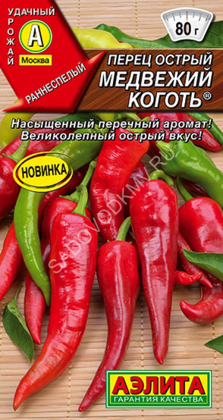 Раннеспелый (105-110 дней) сорт для открытого грунта и пленочных укрытий. Растение раскидистое, высотой 50 см. Плоды многочисленные, направлены вверх, конические, гладкие, глянцевые, в технической спелости светло-зеленые, в биологической – красные, массой 60-70 г. Толщина стенки 6-7 мм. Урожайность 5,5-6,0 кг/м2. Ценность сорта: обильное и дружное раннее плодоношение, отличные вкусовые и товарные качества. Назначение универсальное. Отлично подходит для консервирования и фарширования.