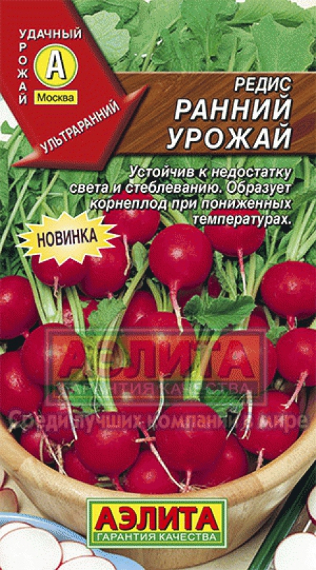 Ультраскороспелый сорт редиса (срок созревания корнеплодов 16 дней) для ранней выгонки в открытом и защищенном грунте. Корнеплоды округлой формы, выравненные, ярко-красные. Мякоть белая, нежная, очень сочная. Эфирные масла, придают деликатесный слабоострый вкус. Сорт высокоурожайный, устойчив к растрескиванию корнеплодов и стрелкованию. Редис повышает аппетит и улучшает пищеварение.