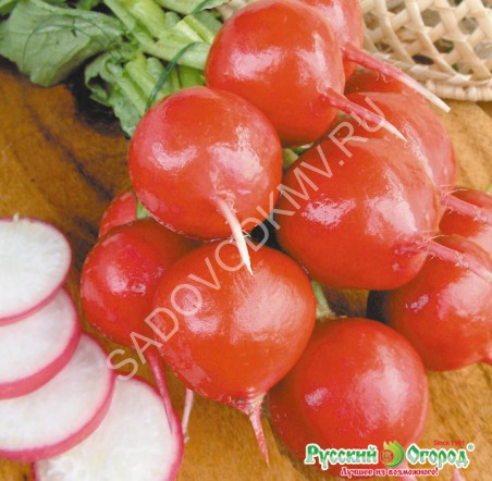 Период от всходов до уборки 20-23 дня. Корнеплоды ярко-красные, округлые, с тонким корешком, массой 25-30 г. Мякоть без пустот, сочная, без горечи. Устойчив к цветушности.
