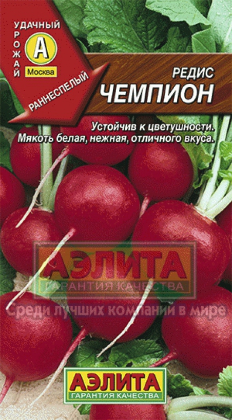 Один из лучших сортов для всесезонного выращивания в закрытом и открытом грунте. Среднеспелый (25-30 дней от всходов до сбора урожая), устойчивый к высоким летним температурам и преждевременному стрелкованию. Дружно формирует высокий урожай – 1,5-2,5 кг/м2. Корнеплоды крупные (15-25 г), округлые, ярко-красного цвета. Мякоть белая, вкус приятный, слабоострый. Длительное время сохраняет товарные качества, корнеплоды не растрескиваются, не дряблеют.