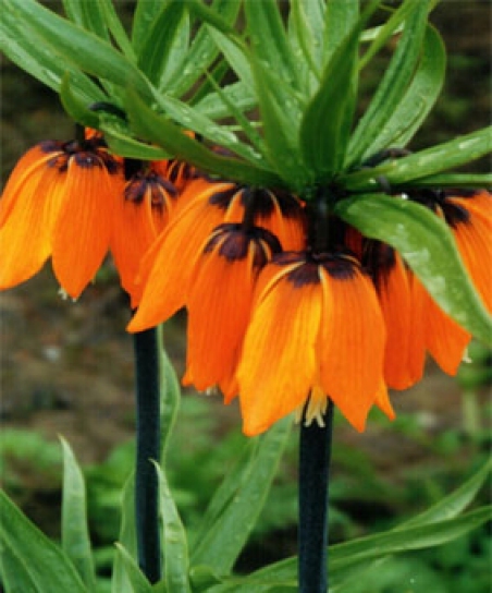 Цветы золотисто-оранжевого цвета с очень красивым фиолетовым узором вен на всем протяжении лепестков, нектарники обрамлены в фиолетовый цвет.