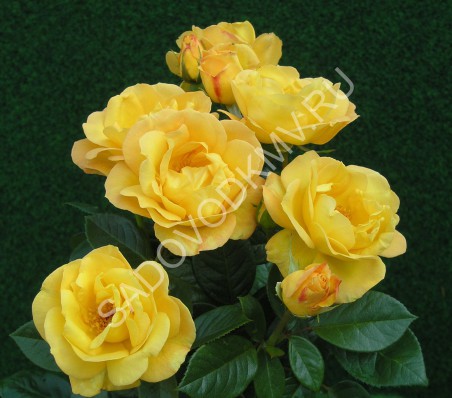 Цветки размером 6-7 см раскрывшись, желтые, но края лепестков со временем становятся ярко-алыми, а затем малиновыми, в то время, как желтый цвет выгорает. Темно-зеленая, глянцевая листва.