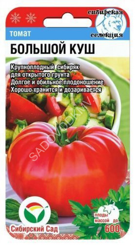 Среднеспелый (100-117 дней) сорт для открытого грунта, пленочных парников и теплиц. Растение индетерминантное, высотой до 1,5 м. В кисти формируется 3-4 плода. Плоды крупные, мясистые, конусовидной формы, золотисто-желтой окраски, гладкие, массой 400-600 г, мясистые. Ценность сорта: крупноплодность, отличные вкусовые качества плодов, высокое содержание сахаров и каротина. Рекомендуется для употребления в свежем виде и переработки на томатопродукты.