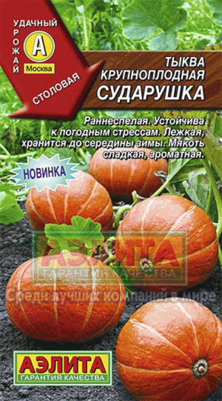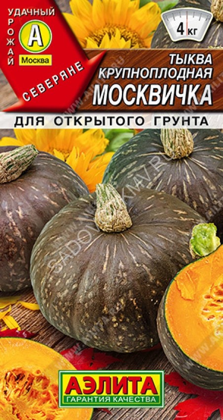 Уникальный высокоурожайный гибрид мускатной тыквы, прекрасно растет и продолжительно плодоносит во всех регионах. Растение мощное, плетистое, хорошо противостоит болезням. Первые плоды можно убирать через 50 дней после появления всходов (для закладки на хранение сбор производят через 85-90 дней). Плод цилиндрический с утолщением на одном конце, оранжевого цвета с темно-зелеными полосами, массой 1,0-1,5 кг. Мякоть оранжевая, с повышенным содержанием каротина, очень вкусная. Плоды отлично хранятся. Посев на рассаду — в апреле, высадка рассады в грунт — в мае – июне. Посев непосредственно в грунт — в конце мая – июне. Глубина заделки 3-4 см. Схема посадки: 100х150 см.