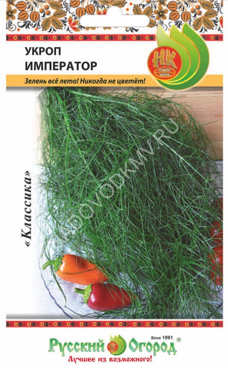 Уникальный сорт кустового укропа для получения зелени и специй. Очень долго не цветет, что позволяет все лето собирать свежую зелень практически без повторных посевов. Растение компактное, средней высоты, с приподнятой розеткой, благодаря чему зелень не загрязняется во время дождей и ее легко убирать. Листья длинные, широкие, зеленые, сильнорассеченные, с сильным ароматом. Масса одного растения при уборке на зелень от 30 до 150 г, при уборке на специи — 220 г. Урожайность на зелень 1,7 кг/м², на специи — 2,2-4,1 кг/м². Посев семян в грунт производят в конце апреля - начале мая. Сорт можно выращивать через рассаду, чтобы получить урожай уже во второй половине мая.