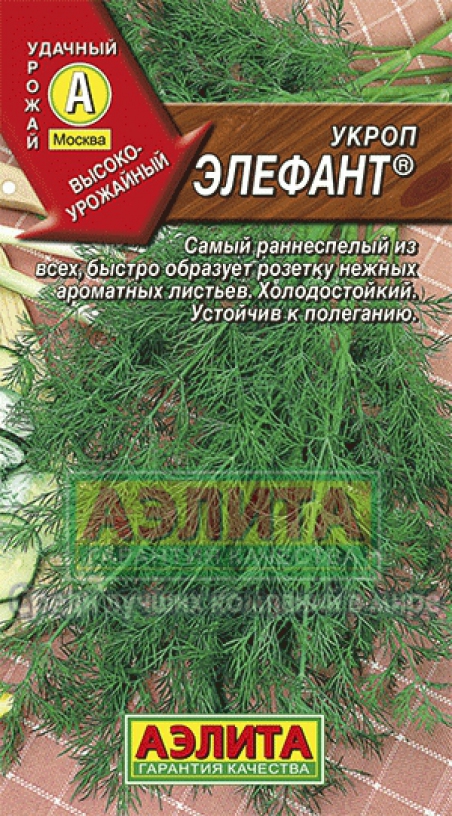 Раннеспелый (30-35 дней от всходов до уборки зелени, 70-80 дней от всходов до уборки на специи) сорт. Предназначен для выращивания на зелень и специи. Пряная свежая зелень широко используется в домашней кулинарии: в салатах, закусках, первых и вторых блюдах, сушеная — в качестве ароматной приправы. Зонтики и семена придают особый укропный аромат овощным и грибным соленьям и маринадам. Розетка крупная, приподнятая, высотой 25-30 см. Листья зеленые с крупными сегментами. Зелень нежная, сочная, обладает высокой ароматичностью. Сорт характеризуется стабильной урожайностью, неприхотливостью. Урожайность на зелень 1,4-3,1 кг/м2, на специи 2,9-5,7 кг/м2.Посев в грунт производится в конце апреля – начале мая. Для непрерывной срезки зелени посевы повторяют каждые 10-14 дней.